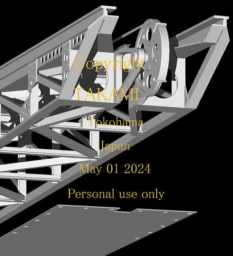 11個の軽め穴の明いた上部レールの手前側、天井板は、画像を非表示にして、リール Assy の構造、取付方法を示しています。 又スカシ文字 Yokohama と Japan の所には、「ハ」の字のフレームが有り天井板を支えています。 天井板、下面床板は非表示にしてます。
