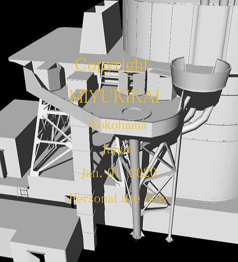 岡本好司氏のアドバイスにより、艦橋背面のガーダーの軽め穴は閉鎖してある。 それは舷側窓の様に、8〜10mm 厚の鋼板で塞いでいるのが、終戦時の写真で見てとれる。 背面部の張り出しは作戦室で、その上に60Cm信号灯が2基設置されている。 スカシ文字のCopyrightの"ig"の下の窓は、後年に高さ半分までを、鋼板で閉鎖した様である。 終戦時の写真における戦闘艦橋は、そう見える。(上掲の写真4参照)