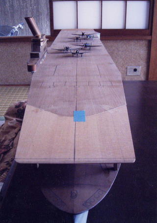 作者は 3F空軍のギャラリーに展示中の艦載機を作られた、TSMC会員の水野志郎氏。 この模型はその展示台として製作中のもので、船は素人との事。 どうしてどうして、かなりリアルで、完成が楽しみです。もう少し進捗したら、是非又写真を送って下さい。