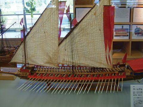 キットのメーカーはHellerで、平成2年頃購入したもので、屋根裏にストックしていました。 船体を接着し石膏を流した時は、全長が600mm程度であったが、船尾(スターン)とバウスプリットを付けたら、それが1,000mmになってしまった。各部品の整合性が抜群に良く、リギングの説明も詳細、明快、親切であった。 組み立て時、オールはラックに収納状態とした。 そうしないと幅をとってしまい、将来保管不能となるのを恐れたためです。 完成時の印象は、雄大で存在感の有るものと感じています。