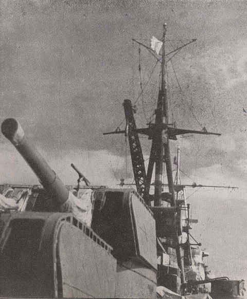 ためか、舵柄信号索はヤードの先端から降ろされている。 艦尾信号灯は機銃増設のため